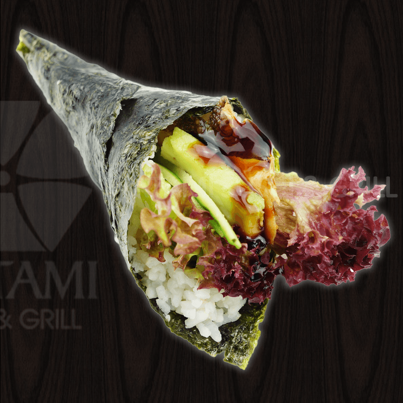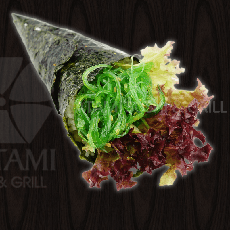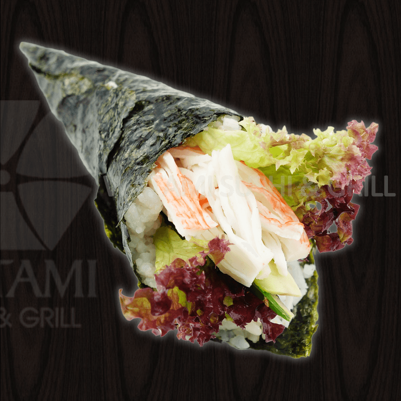 "handgerollt"- hierbei wird das Nori zu einer Tüte gerollt und mit Reis und den Zutaten wie bei Maki-Sushi gefüllt - der ideale Snack für "zwischendurch".